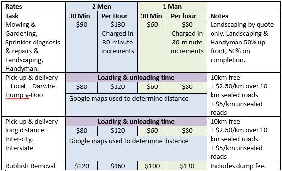 Ute loads & long distance – See rate chart above. Payment before the journey commences.
